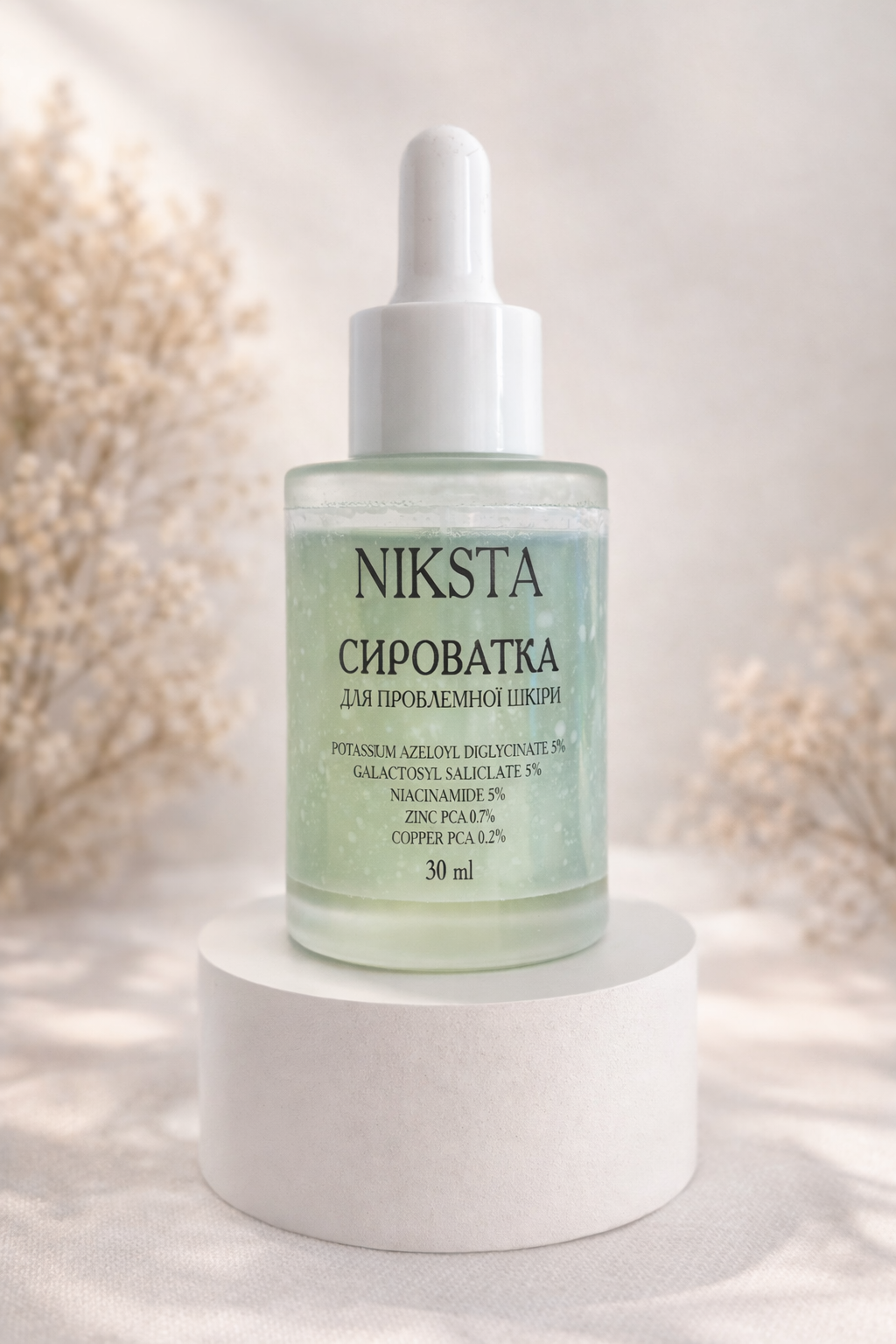Балансуюча сироватка для проблемної та жирної шкіри створена спеціально для шкіри з висипами, комедонами та підвищеною жирністю. Вона м’яко, але ефективно працює з основними причинами акне: надлишковим себумом, запаленням, порушеним процесом відлущування та ослабленим шкірним бар’єром, не пересушуючи і не подразнюючи шкіру. Формула має легку водно-гелеобразну текстуру, швидко вбирається, не забиває пори та підходить навіть для молодої й чутливої шкіри. Сироватка допомагає зменшити кількість запальних і незапальних елементів, нормалізує вироблення себуму, м’яко очищає пори та запобігає їх закупорці, заспокоює шкіру, зменшує почервоніння, вирівнює тон і покращує текстуру шкіри, водночас підтримуючи оптимальний рівень зволоження та здоровий мікробіом.